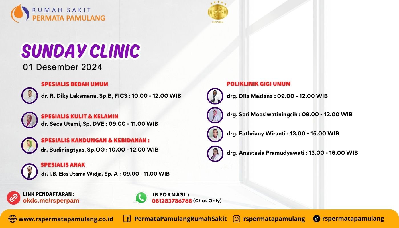 Nikmati layanan kesehatan kami di hari Minggu, 22 Desember 2024 dengan layanan dokter spesialis bedah umum, spesialis penyakit dalam, spesialis kandungan & kebidanan, spesialis kulit&kelamin, dan poliklinik gigi.Untuk pendaftaran bisa klik link : okdc.me/rsperpam atau silakan hubungi bagian pendaftaran kami di no. 081283786768 (chat only)