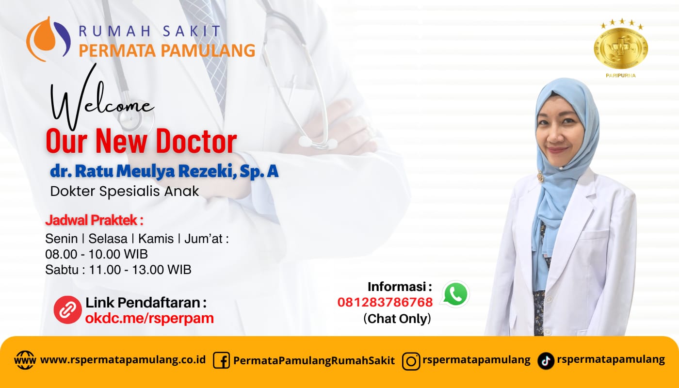 Telah bergabung bersama kami dokter spesialis anak dr. Ratu Meulya Rezeki, Sp.A dengan jadwal praktek sbb :Senin | Selasa | Kamis | Jum’at : 08.00 – 11.00 WIBSabtu : 11.00 – 13.00 WIB Untuk pendaftaran, silahkan klik laman okdc.me/rsperpam atau untuk informasi lebih lanjut silahkan menghubungi kami di 081283786768 (chat only).