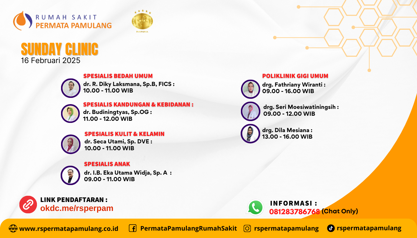 Nikmati layanan Kesehatan kami di hari Minggu, 16 Februari 2025 dengan layanan dokter spesialis bedah umum, spesialis kulit & kelamin, spesialis anak, spesialis kandungan & kebidanan dan poliklinik gigi.Untuk pendaftaran bisa klik link : okdc.me/rsperpam atau silakan hubungi bagian pendaftaran kami di no. 081283786768 (chat only)