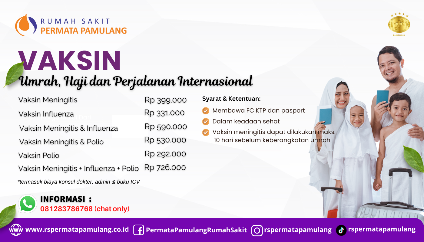 Pastikan kesehatanmu tetap prima sebelum bepergian ke luar negeri, terutama untuk ibadah Haji, Umrah, dan perjalanan internasional lainnya. Segera dapatkan vaksinasi meningitis untuk perlindungan maksimal.Jangan tunda lagi, kunjungi RS Permata Pamulang untuk melakukan vaksinasi dan pastikan Anda siap menjalani perjalanan yang nyaman dan aman.Informasi & pendaftaran :081283786768 (chat only)