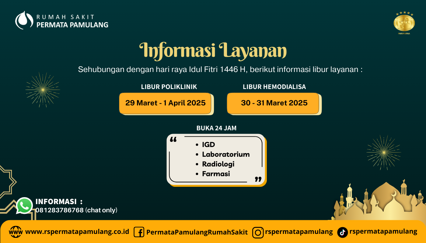 Informasi layanan : Sehubungan dengan hari raya Idul Fitri 1446 H, berikut informasi libur layanan :29 Maret – 1 April 2025 : Poliklinik libur30 – 31 Maret 2025 : Hemodialisa liburTetap buka 24 jam : IGD, laboratorium, radiologi, farmasi Informasi : 081283786768 (chat only)