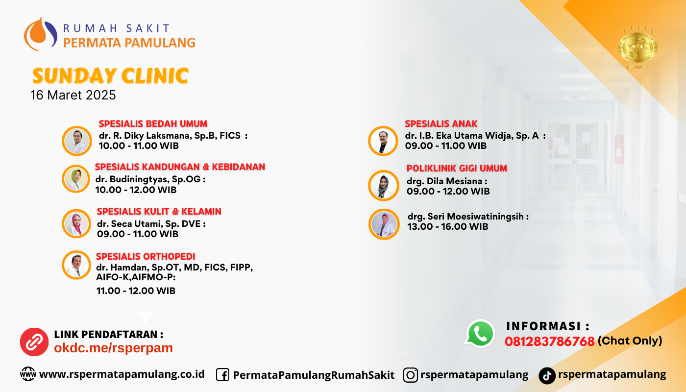 Nikmati layanan kesehatan kami di hari Minggu, 16 Maret 2025 dengan layanan dokter bedah umum, spesialis kulit & kelamin, spesialis kandungan & kebidanan, spesialis anak, spesialis orthopedi dan poliklinik gigi. Untuk pendaftaran bisa klik link : okdc.me/rsperpam atau silakan hubungi bagian pendaftaran kami di no. 081283786768 (chat only)