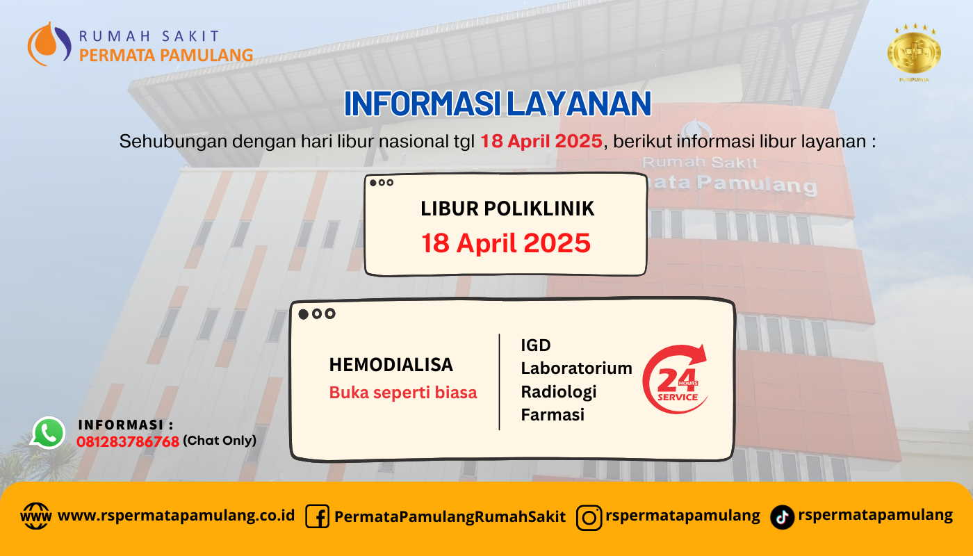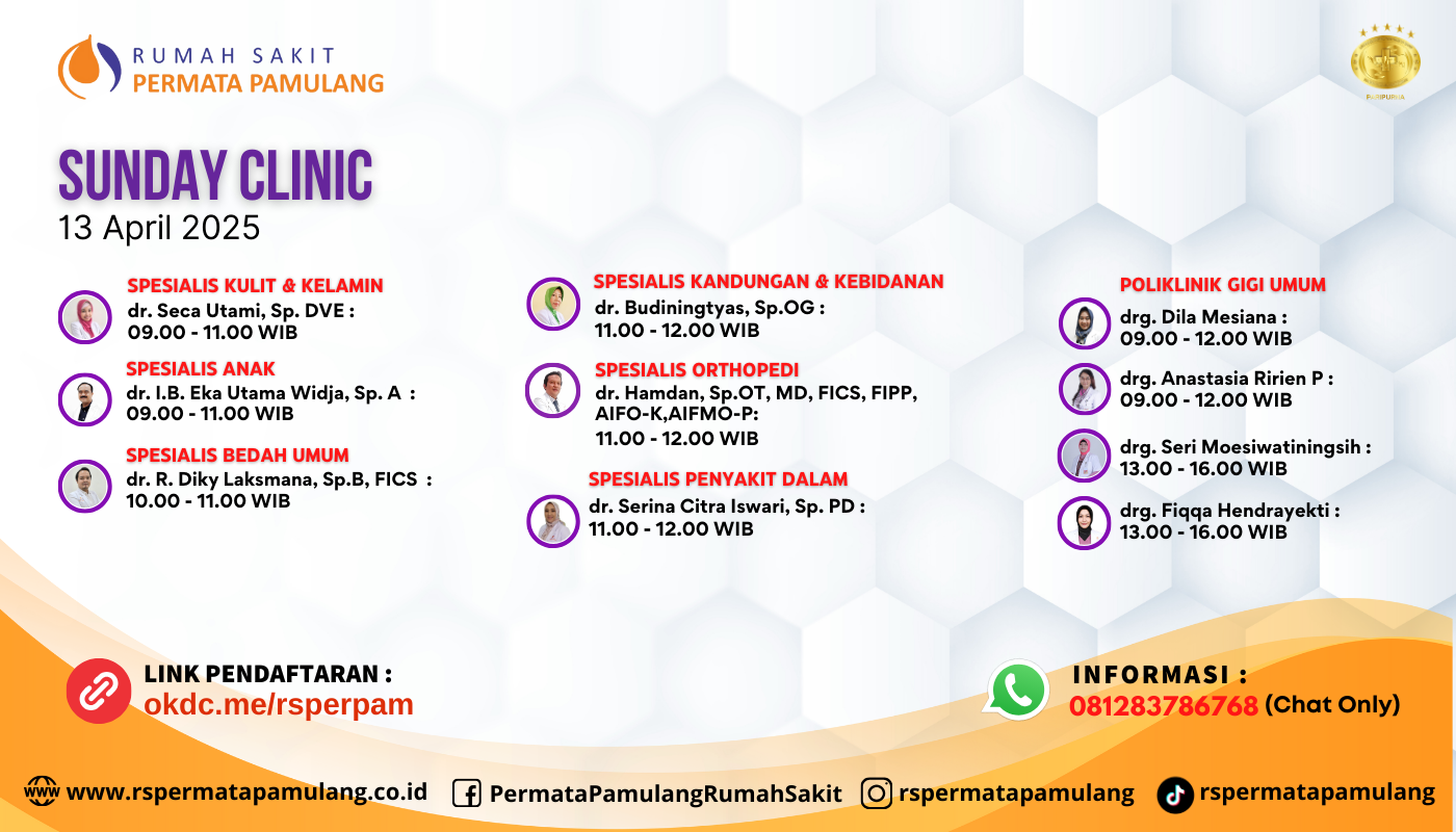 Nikmati layanan kesehatan kami di hari Minggu, 27 April 2025 dengan layanan dokter spesialis kulit & kelamin, spesialis anak, spesialis bedah umum, spesialis penyakit dalam, dan poliklinik gigi. Untuk pendaftaran bisa klik link : okdc.me/rsperpam atau silakan hubungi bagian pendaftaran kami di no. 081283786768 (chat only)