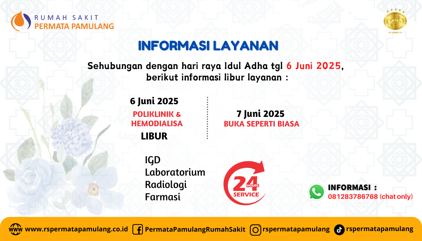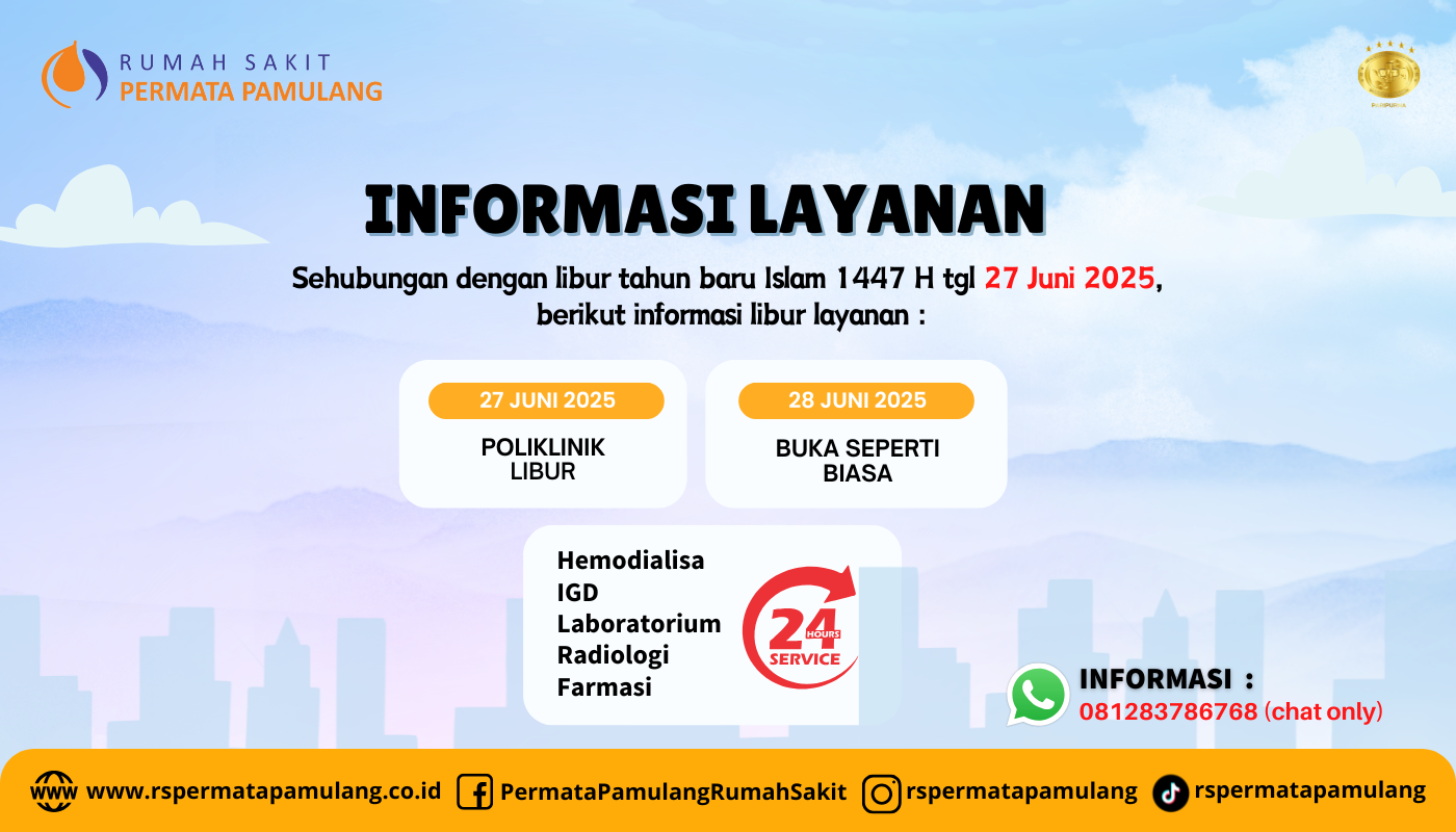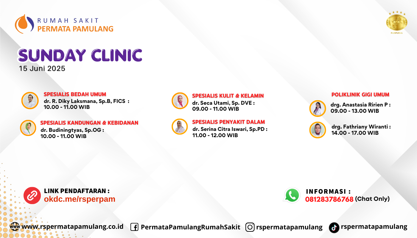 Nikmati layanan kesehatan kami di hari Minggu, 29 Juni 2025 dengan layanan dokter spesialis bedah, spesialis penyakit dalam, spesialis kandungan dan poliklinik gigi.Untuk pendaftaran bisa klik link : okdc.me/rsperpam atau silakan hubungi bagian pendaftaran kami di no. 081283786768 (chat only)