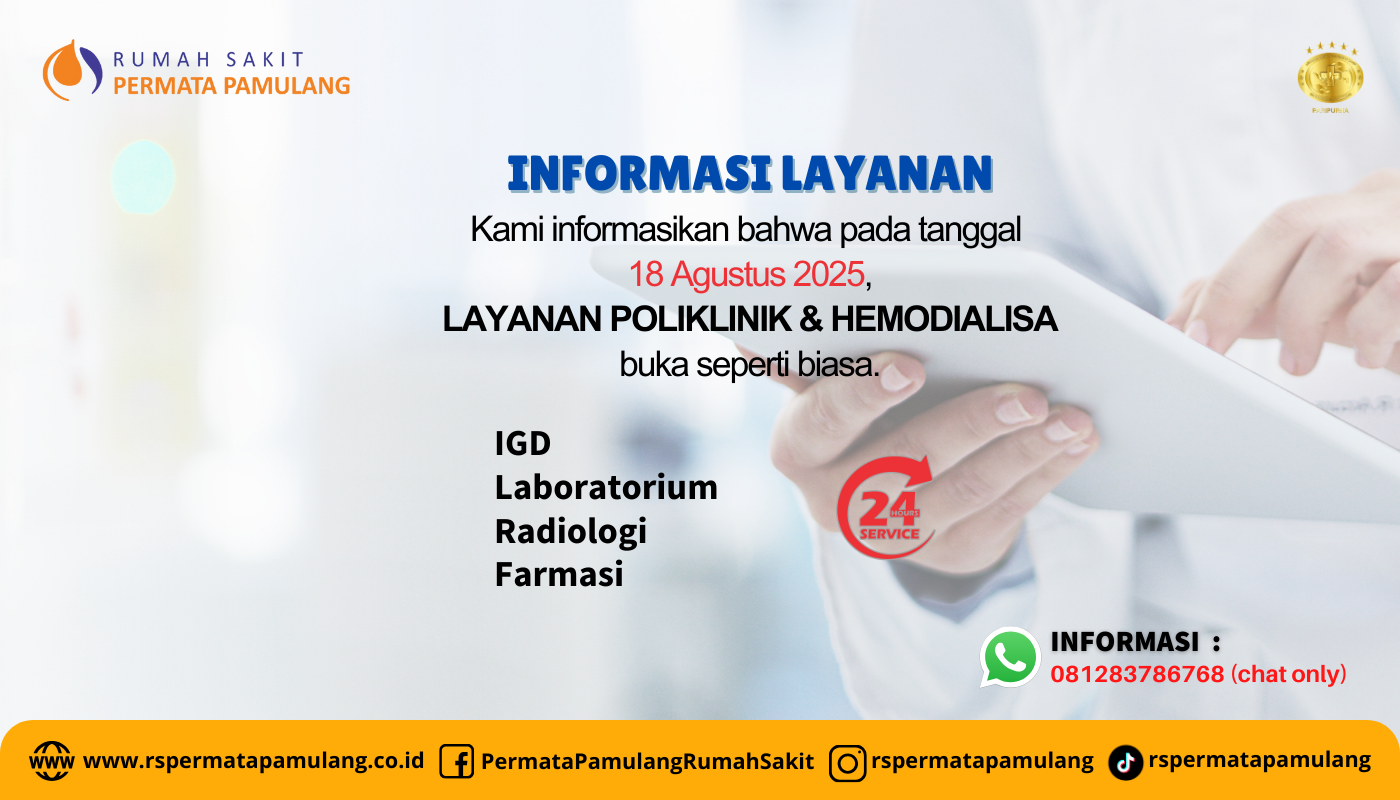 Kami informasikan bahwa pada tanggal 18 Agustus 2025,LAYANAN POLIKLINIK & HEMODIALISA buka seperti biasa.Tetap buka 24 jam : IGD, laboratorium, radiologi, farmasi Informasi : 081283786768 (chat only)