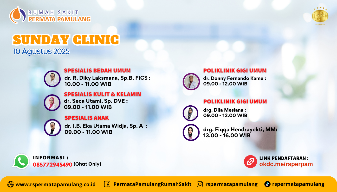 Tidak sempat ke rumah sakit di hari kerja? Tenang, kini Anda bisa memeriksakan kesehatan tanpa mengganggu jadwal harian Anda.Sunday Clinic hadir khusus di hari Minggu untuk memberikan pelayanan kesehatan yang cepat, nyaman, dan profesional.Yuk datang ke Sunday Clinic RS Permata Pamulang tanggal 10 Agustus 2025 🕘 Jadwal lengkap & pendaftaran di: okdc.me/rsperpam📱 Info: 085772945490 (Chat […]