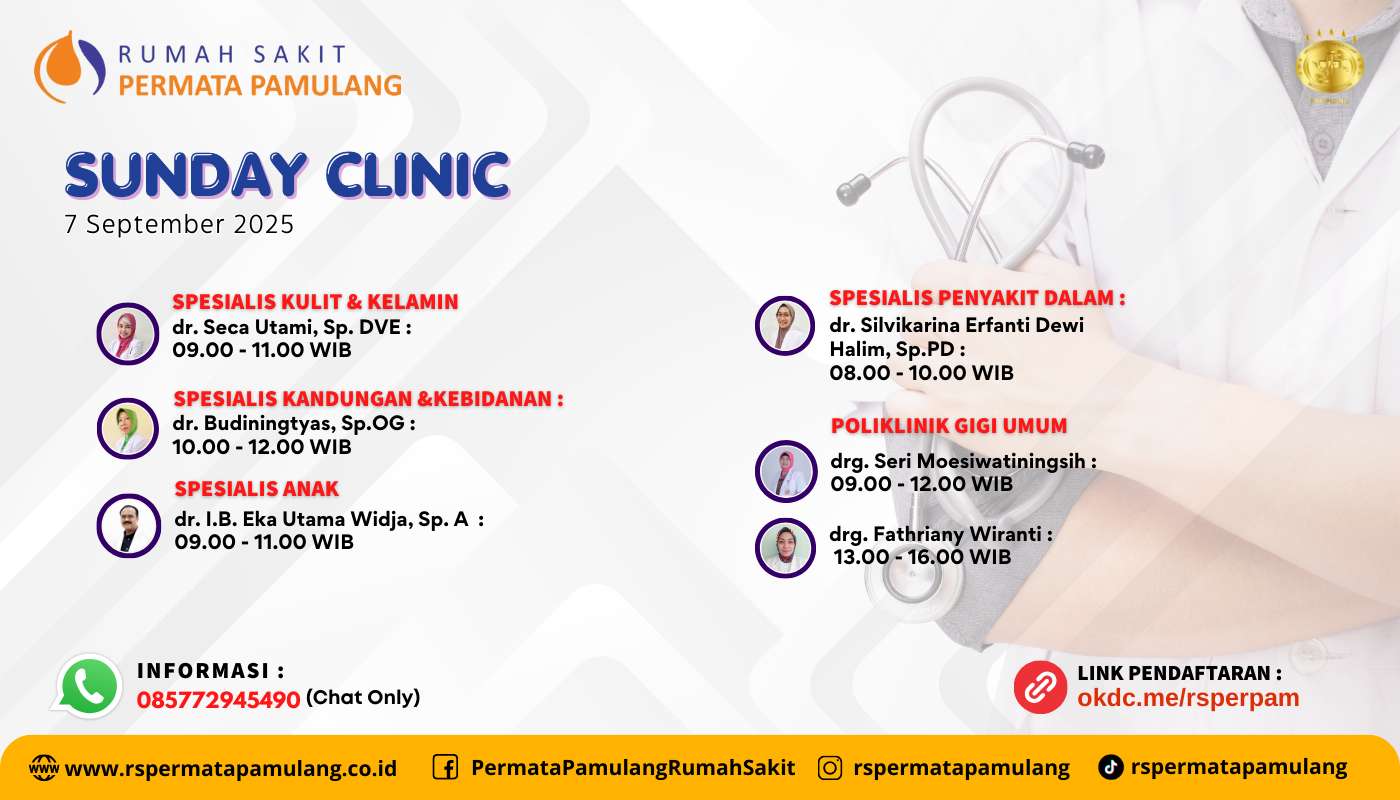 Kami hadir dengan layanan Sunday Clinic khusus untuk Anda yang sibuk di hari kerja.Layanan meliputi: poli anak, poli kulit & kelamin, poli penyakit dalam, poli kandungan & kebidanan dan poli gigi.Pastikan kesehatan Anda tetap terjaga, bahkan di akhir pekan.Link pendaftaran : okdc.me/rsperpamInformasi : 081283786768 (chat only)