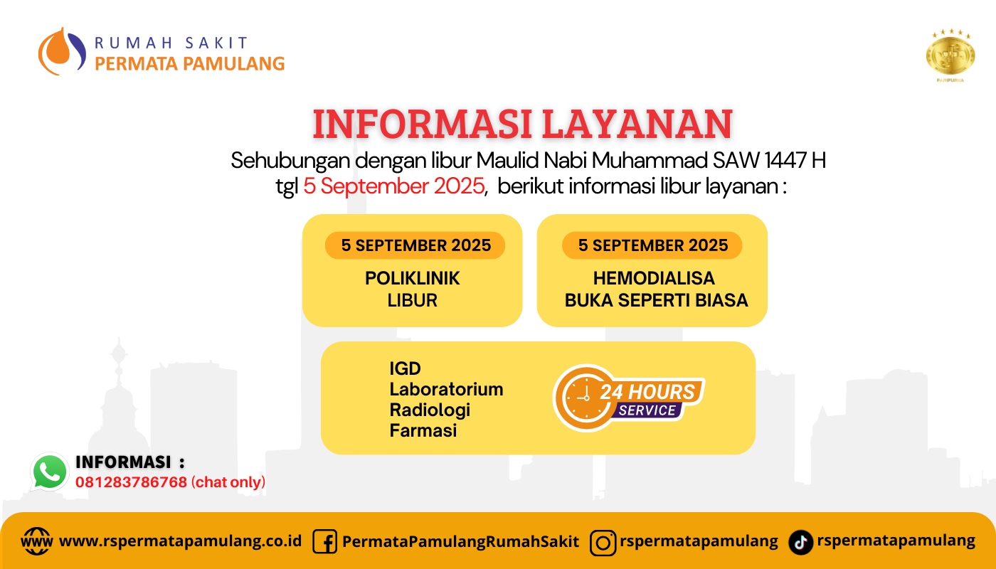 Sehubungan dengan libur Maulid Nabi Muhammad SAW tgl 5 September 2025, berikut informasi libur layanan :Poliklinik : LiburTetap buka 24 jam : Hemodialisa, IGD, laboratorium, radiologi, farmas Informasi : 081283786768 (chat only)