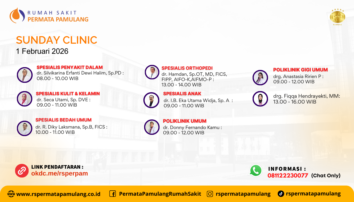 Sunday Clinic RS Permata Pamulang Minggu, 1 Februari 2026 hadir dengan layanan sbb :poli penyakit dalam, poli kulit & kelamin, poli bedah umum, poli anak, poli orthopedi, poli umum, dan poli gigi.Manfaatkan hari libur Anda untuk tetap peduli kesehatan bersama RS Permata Pamulang.