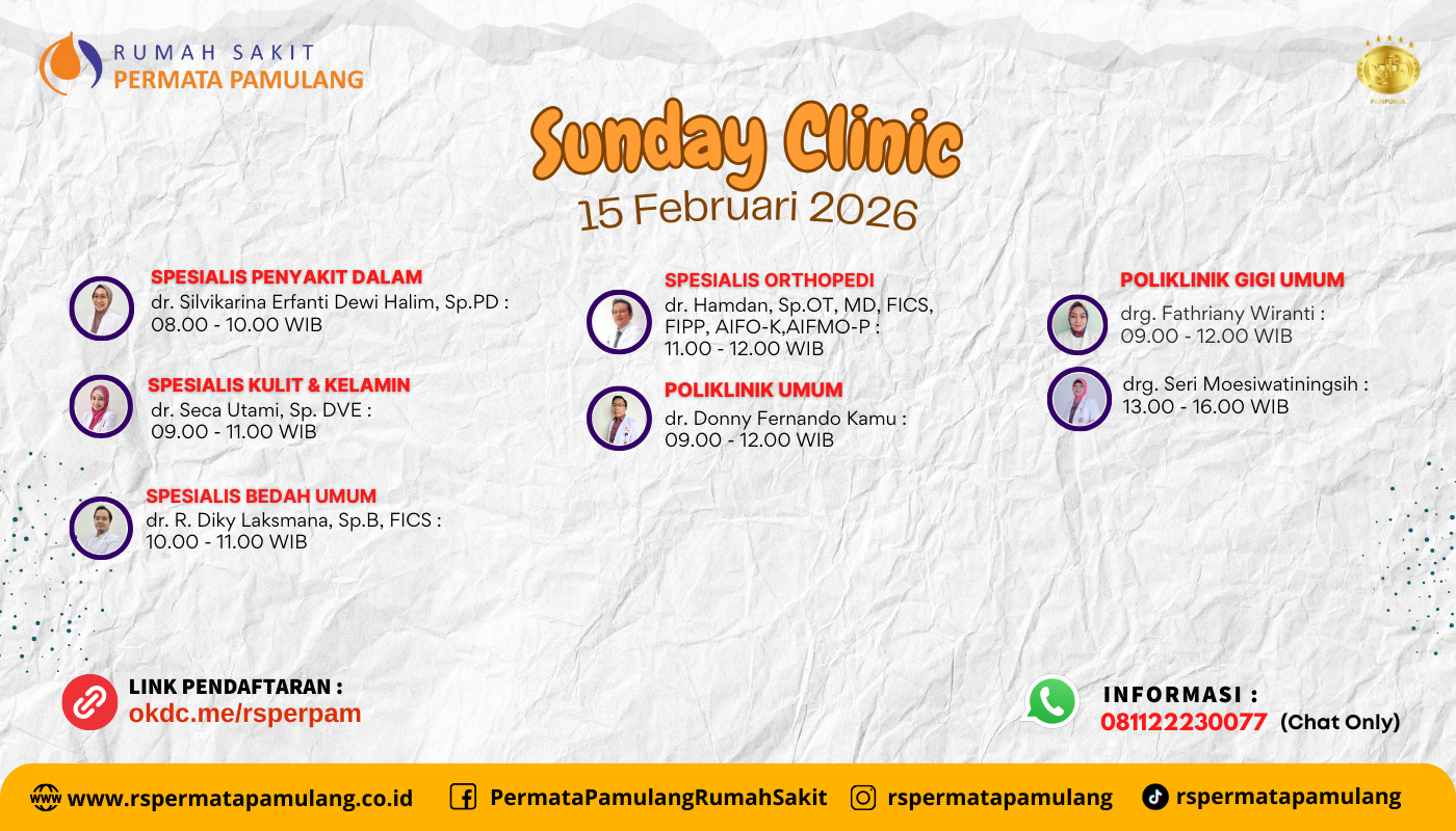 Sunday Clinic RS Permata Pamulang Minggu, 15 Februari 2026 hadir dengan layanan sbb :poli penyakit dalam, poli kulit & kelamin, poli bedah umum, poli orthopedi, poli umum, dan poli gigi.Manfaatkan hari libur Anda untuk tetap peduli kesehatan bersama RS Permata Pamulang.