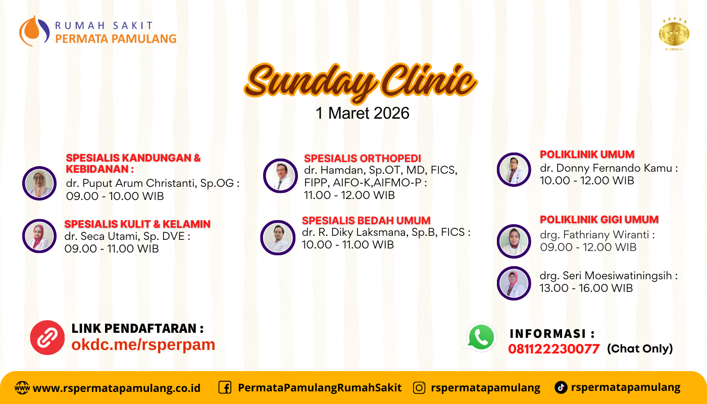 Sunday Clinic RS Permata Pamulang Minggu,1 Maret 2026 hadir dengan layanan sbb :poli kandungan & kebidanan, poli kulit & kelamin, poli bedah umum, poli orthopedi, poli umum, dan poli gigi.Manfaatkan hari libur Anda untuk tetap peduli kesehatan bersama RS Permata Pamulang.Link pendaftaran : okdc.me/rsperpamInformasi : 081122230077 (chat only)